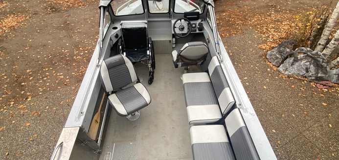 Our boat, the Rum Runner II, was retrofitted in 2021 to include an opening on the loading side with standardized ramp able to support wheelchairs or other mobility aids for ease of boarding. Our boat is fitted with safety locks for wheelchairs, and the adjustable seating allows us to support a range of on-board mobility aids. A canopy provides protection from sun and rain as needed and our boat is fully safety stocked. Our artwork was created by our team member Sarah, and then put together for our awesome wrap and signage by O'Hare Signs. Standardized Personal Floatation Devices and equipment for fishing has been provided curtesy of support from the Bass Pro Shops and Cabela’s Outdoor Fund.